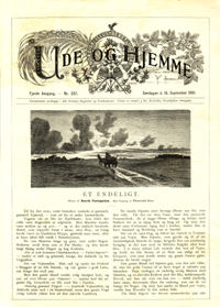 Men varede det altfor længe mellem hver Gang, Stilheden i Stuen blev brudt ved den krattende Lyd af et Blad, der vendtes –; da stak et sødt lille lokket Hoved et Par store aabne Øjne frem bag |66| den anden Side af Bilæggerovnen og spurgte med en blød Pigerøst:
