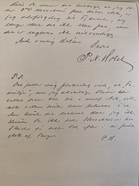Da der har været meget at rette i medfølgende 2½ Ark, følger jeg Deres Opfordring til at sende Dem disse efter endt Korrektur, særlig da Pontoppidan har lagt mig de sidste Ark særlig paa Hjærte, fordi han har skrevet dem i Hast. Mange Aars Korrekturlæsning har ganske vist gjort mig ret fortrolig med Pontoppidans Stil, men det er første Gang, at jeg hélt paa egen Haand har taget mig af saa stor en Del af en Bog.
