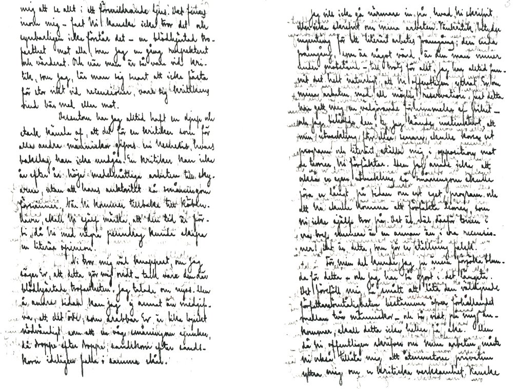Ni märker nog att det icke är en ömklig sårad fåfänge, som andas ur mina ord. Hvad som säges offentligen om mina arbeten är mig numera ganske likgiltigt. Jag kan på förhand konstruera fram – ur mitt eget medvetandes djup – hvad det skall falla herr X och herr Y in att säga om mina böcker. Slå ihjäl mig kan hvarken [slut på side 4, fortsættelsen mangler]